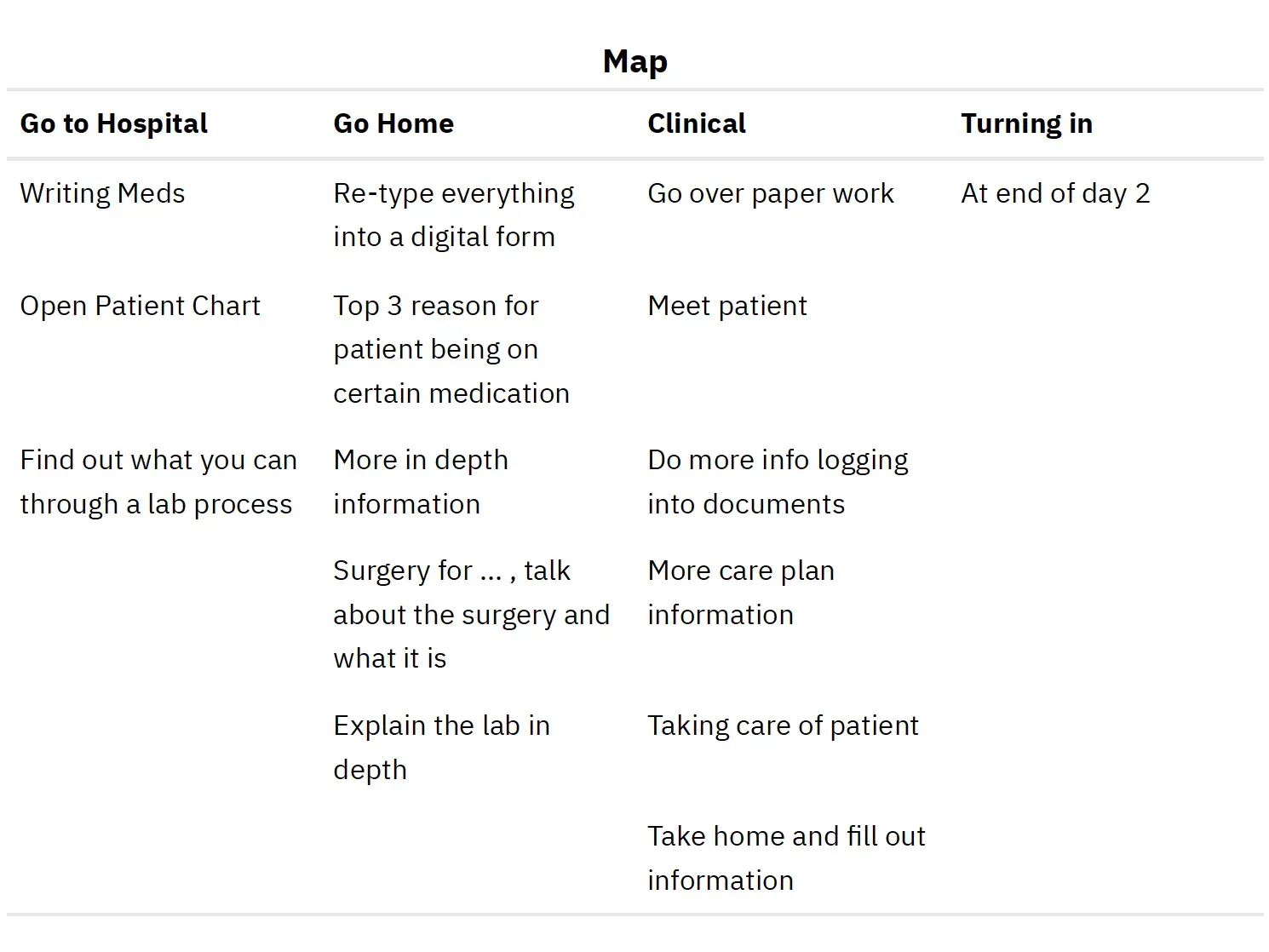 At the end of our map planning, we moved directly into goals which changed in order to fit the Nurses criteria and gain a better understanding for how our app should work.